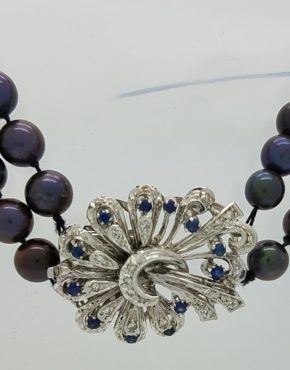 BLACK PEARLS DOUBLE STRAND WITH SAPPHIRES AND DIAMONDS LOCK OR BROOCH