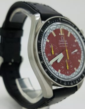 Omega Speedmaster Schumacher Red & White Dial Chronograph Black Leather Strap Mens Watch